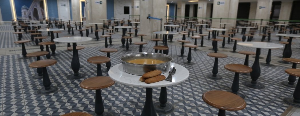 İç kapılardan geçildikten hemen sonra kaşık ve ekmek alınır. Çorbalar beş kişilik masaların ortasına konur. Taburelerin ve masaların genel tasarımı dairesel biçimdedir. Zaten bilindiği üzere bizim kültürümüzde sofralarımız genellikle daire şeklindedir. Müminler sohbet, ders gibi faaliyetlerde halka olurlar. Halkanın yani çemberin her noktada merkeze uzaklığı aynıdır. Ayrıca her nokta hem başlangıçtır hem sondur. Köşeli dizilimlerde ise ister istemez bir hiyerarşi oluşur. Belki bu vesileyle belki başka sebeplerden bizim tarihimizde halka halinde bir araya gelmek daima rağbet görmüştür.
